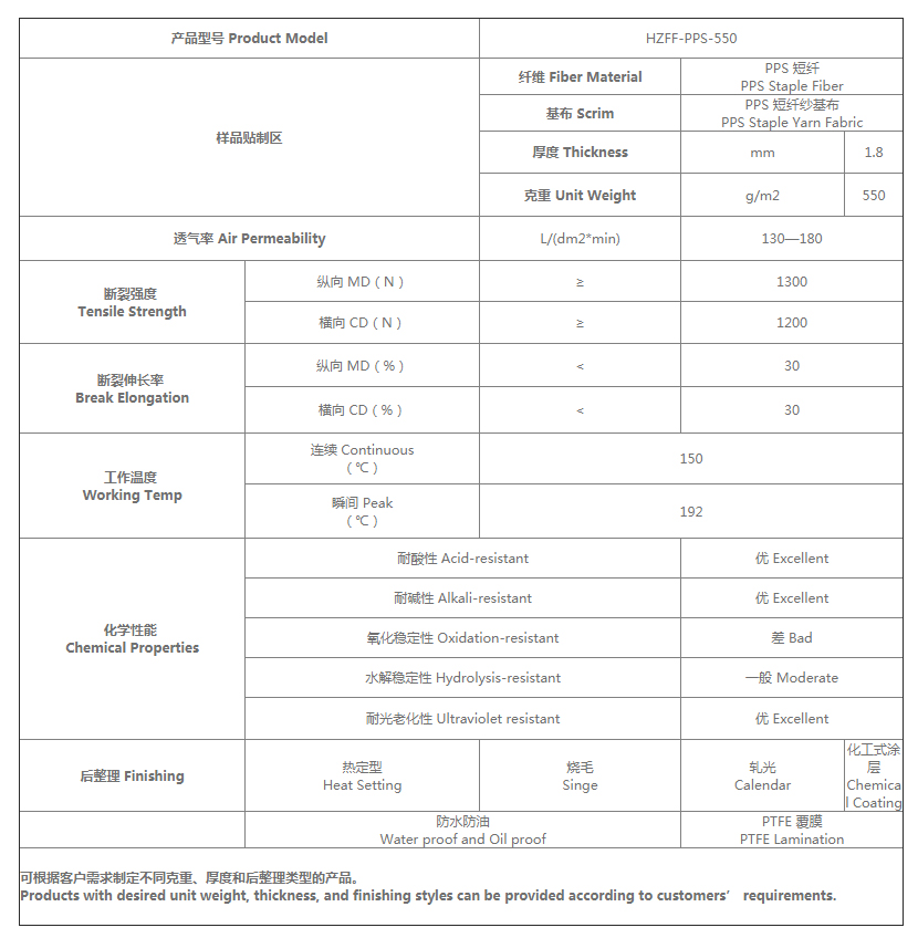 PPS 中文名為聚苯硫醚。本公司所生產(chǎn) PPS 針刺過濾氈的纖維原料來自Procon®(日本 Toyobo) 、Torcon®、 Celanese®、Fortron®(日本 Toray) 、PPS纖維(四川得陽科技股份有限公司)等國內(nèi)外著名企業(yè),產(chǎn)品具有優(yōu)異的熱穩(wěn)定性和阻燃性,熔點為 285℃,能抗多種酸堿,可在潮濕、化學(xué)物質(zhì)氛圍和高溫條件下使用。PPS對過濾氣體中的含氧量有特殊要求,同時也與使用溫度密切相關(guān)。